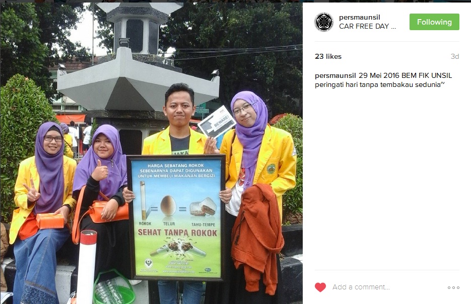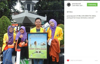 Tasikmalaya, Car Free Day Kota Tasikmalaya yang terletak di jalan H. Z. Mustafa Minggu (29/05) terlihat lebih ramai dari biasanya. Selain diramaikan oleh Mahasiswa Pendidikan Geografi dengan aksinya dalam memperingati Hari Lingkungan Hidup, BEM Fakultas Ilmu Kesehatan Universitas Siliwangi juga ikut memeriahkan Car Free Day dalam Peringatan Hari Besar Kesehatan yaitu Hari Tanpa Tembakau Sedunia.
