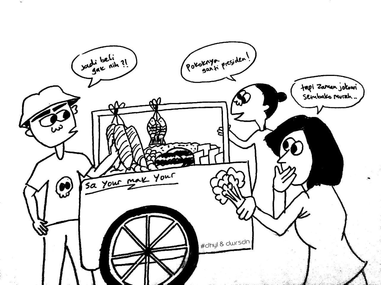 Dulu, ibu-ibu beli sayur biasanya ngomongin harga pangan macam cabai, bawang atau pemeran sinetron yang antagonis, tapi sekarang ngomongnya jadi: Saya kasih contohnya ya, “Bu, Ibu milih siapa nanti?” ujar Ibu A bertanya ke Ibu B, Ibu B menjawab, “Ah, saya mah pilih yang ganteng aja deh hihihi.” Ibu A menanggapi, “Oh, berarti yang nomor dua ya.” Dengan cepat Ibu A langsung memberikan justifikasi bahwa Ibu B akan memilih nomor dua, padahal berdasarkan beberapa artikel mengenai ganteng dan sebagainya, disimpulkan bahwa ganteng itu relatif. Jadi, si Ibu B bilang, “Yang ganteng aja deh,” itu relatif. Tapi, karena ada bumbu politik jadilah si Ibu A menjustifikasikan milih nomor dua.