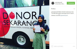 Tria Moulina (Pendidikan Bahasa Inggris) adalah salah satu mahasiswi yang sudah tiga kali mendaftar donor darah. Selain untuk menjaga kesehatan, Tria mendaftarkan diri karena termotivasi dengan teman sekelasnya. “Pertama kali donor awalnya memang takut dengan jarum yang besar dan sedikit sakit. Efek setelahnya tangan menjadi pegal,” ungkapnya. Tria juga pernah mengajukan diri untuk donor, tetapi belum berhasil karena kekurangan hB yang dipicu oleh kurang tidur (begadang). Meskipun demikian, Tria tetap semangat mengikuti donor darah. Berharap agar mahasiswa lain ikut donor darah karena hal tersebut tidak menyakitkan dan justru membuat badan menjadi enteng.