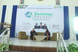 Pembicara Seminar Nasional sedang memberikan materi kepada seluruh peserta. Semnas ini diselenggarakan oleh Himpunan Mahasiswa Sipil Unsil di Gedung Mandala pada hari Rabu, 25 Oktober 2017. (Sumber Foto: Aris)