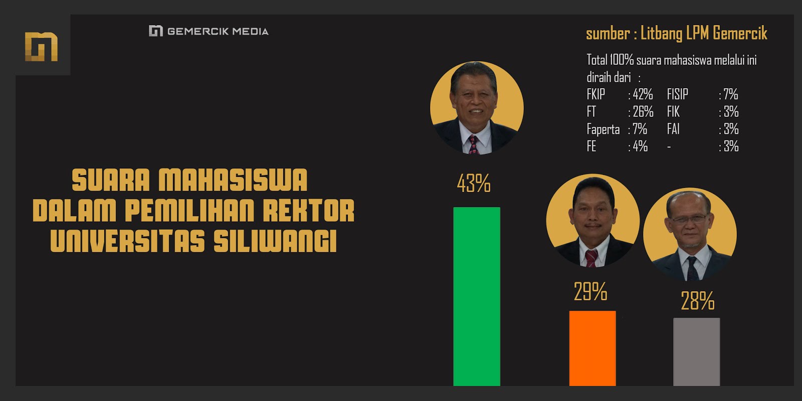 Total 100% suara mahasiswa ini diraih dari 42% suara mahasiswa Fakultas Keguruan dan Ilmu Pendidikan (FKIP), 26% suara mahasiswa Fakultas Teknik (FT), 8% suara mahasiswa Fakultas Pertanian (Faperta), 7% suara mahasiswa Fakultas Ilmu Sosial dan Ilmu Politik (FISIP), 7% suara mahasiswa Fakultas Ekonomi, 4% suara mahasiswa Fakultas Ilmu Kesehatan (FIK), 3% suara mahasiswa Fakultas Agama Islam, dan 3% suara mahasiswa yang tidak diketahui dari fakultas mana ia berasal.