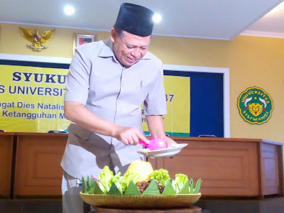 Rudi Priyadi Rektor Universitas Siliwangi sedang memotong tumpeng dalam rangka acara puncak syukuran Dies Natalis Unsil yang ke-37