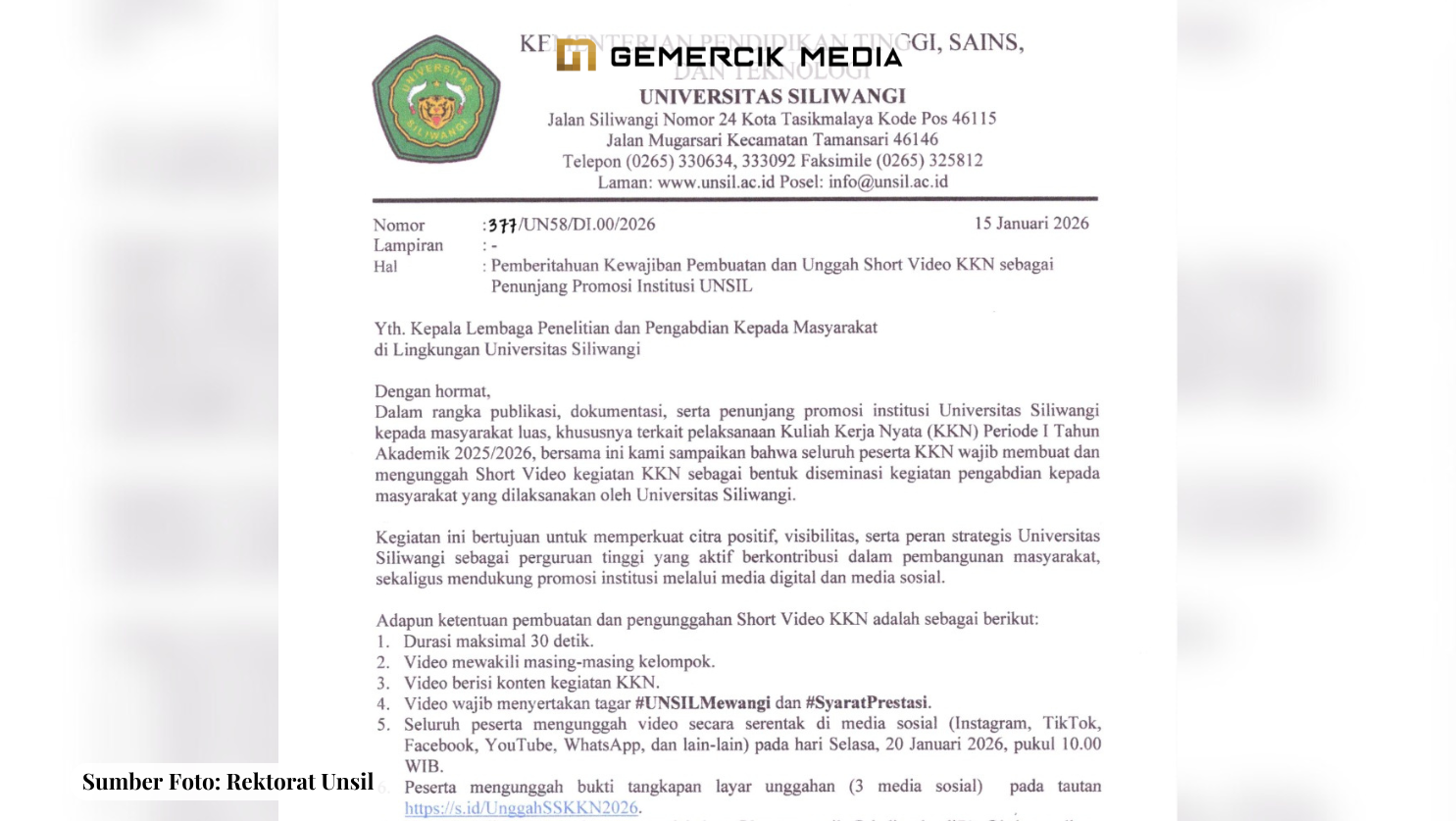 Gemercik News – Universitas Siliwangi (20/01). Wakil Rektor Bidang Akademik Universitas Siliwangi (Unsil), Prof. Dr. H. Dedi Kusmayadi, S.E., M.Si., Ak., CA., CRBC., ACPA., CPA., CRA., CRP., CSBA., ASEAN-CPA., mengklarifikasi mengenai surat pemberitahuan terkait kewajiban pembuatan dan pengunggahan short video Kuliah Kerja Nyata (KKN) dan Pendidikan Bela Negara (PBN) yang menandai akun-akun para pejabat publik merupakan bentuk pengenalan Unsil, dan tidak berkaitan dengan kepentingan politik tertentu.